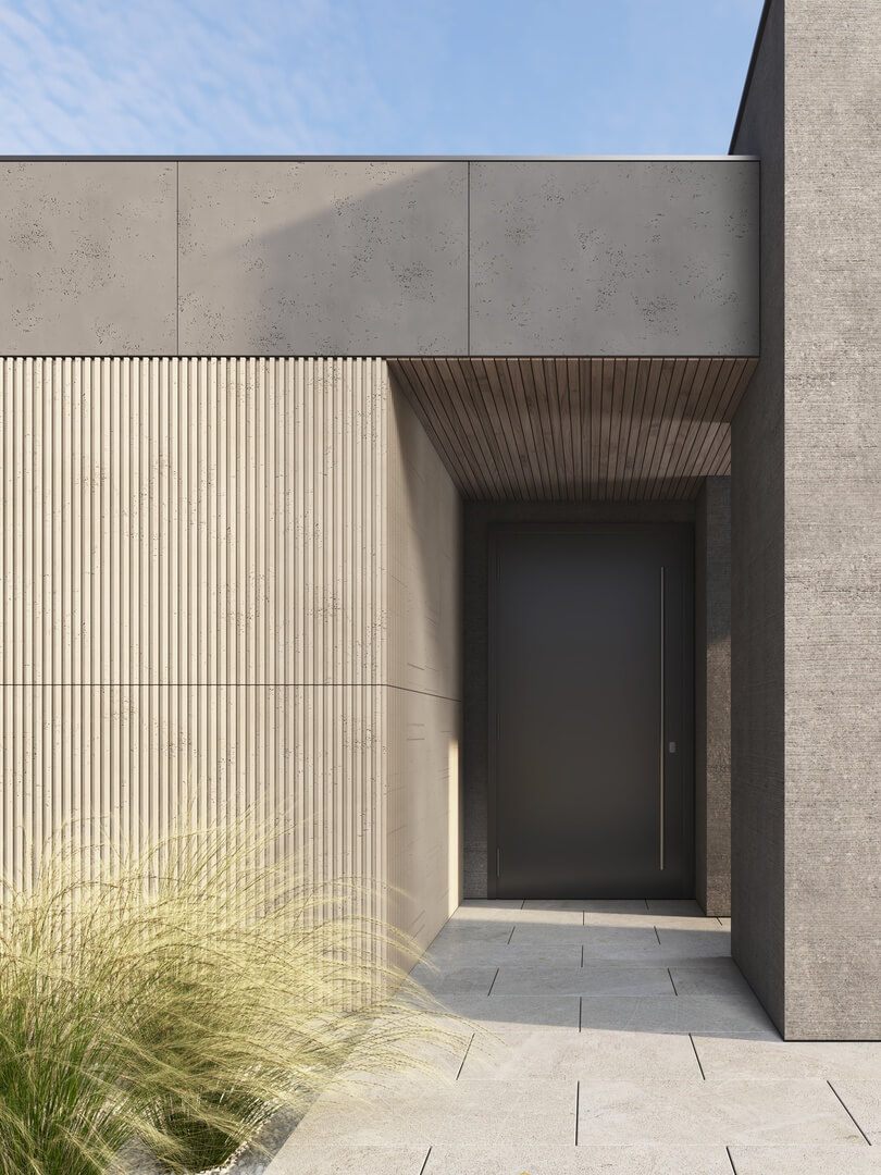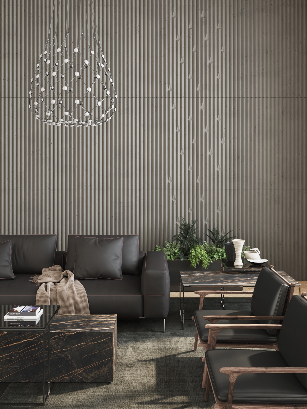 Lamella panels feature slender, ribbed textures that evoke vertical wooden slats, translated into durable concrete. Their design combines elegance with acoustic functionality, making them suitable for modern interiors such as offices, restaurants, or residential living areas. Lamella balances refined aesthetics with architectural practicality.
